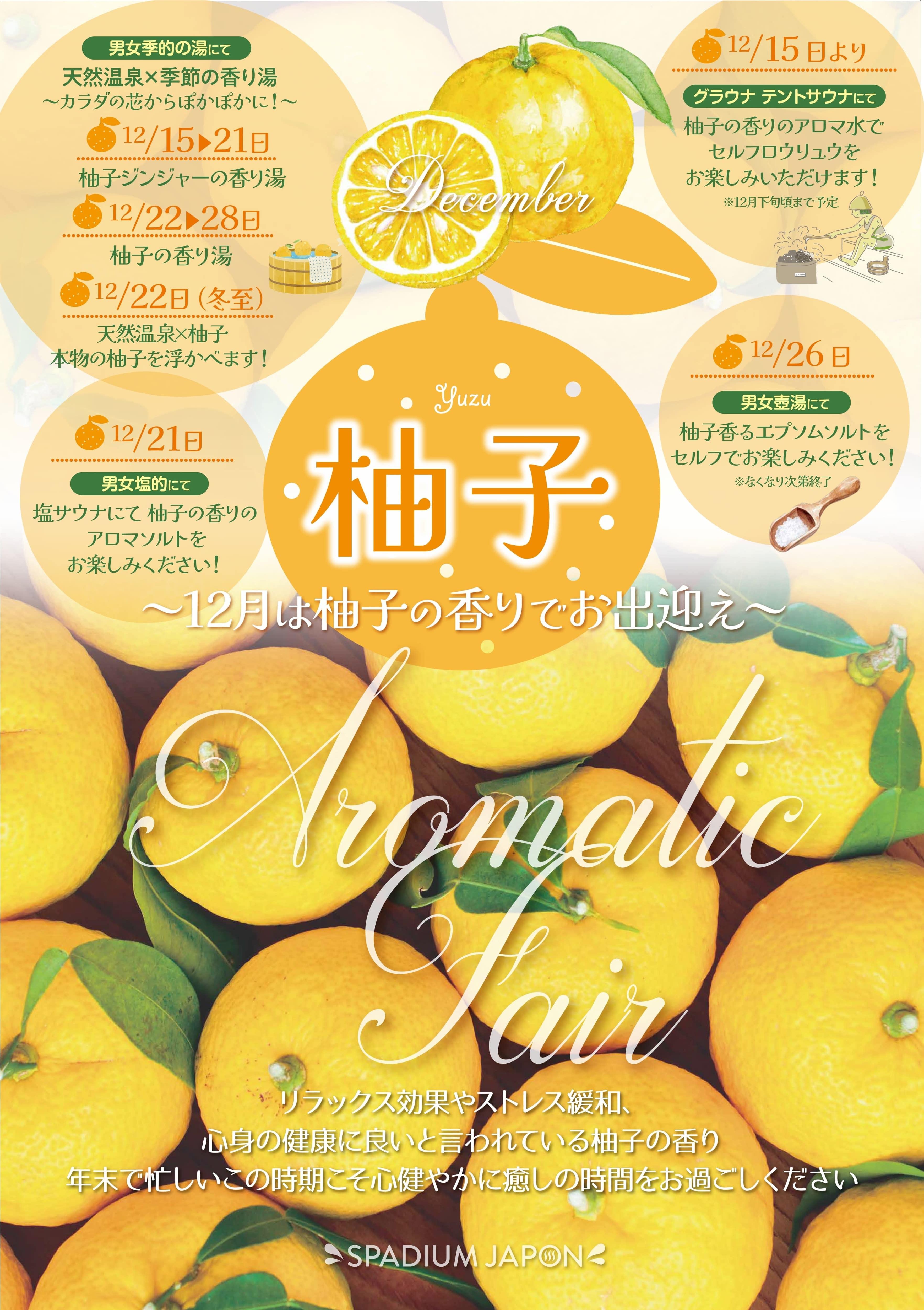 また、冬至は本物の柚子を天然温泉の季的の湯に浮かべます!寒い冬カラダの芯からぽかぽかに、そして香りのリラックス効果で癒しのひと時をお過ごしください。~スパジャポでは冬の期間、3階のご入館を柚子の香りでお出迎えしております~