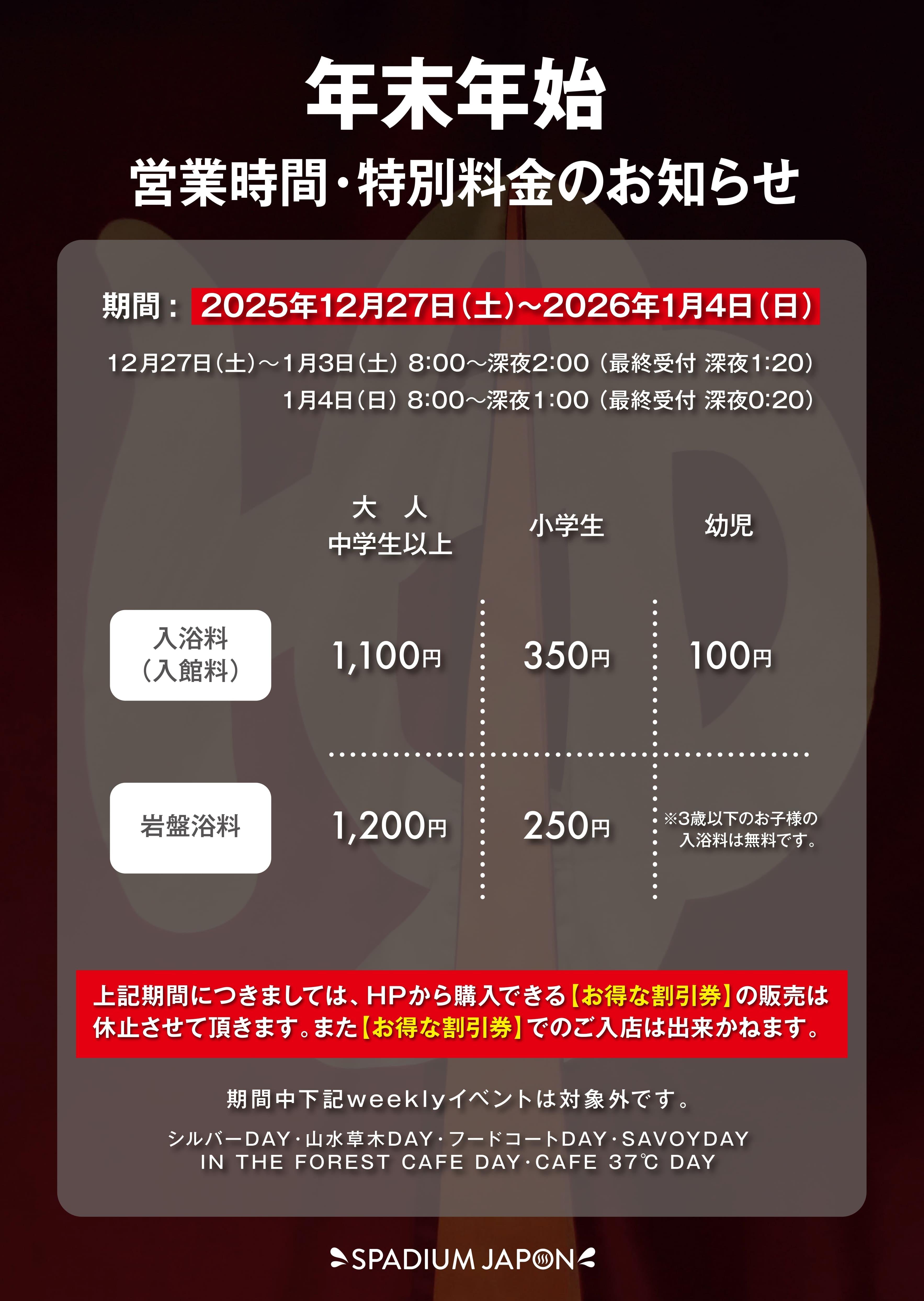 2025年12月27日から2026年1月4日まで以下の通り営業時間・料金が変更となり、期間中「お得な割引券」の販売及び、購入済チケットはご利用になれませんので、予めご了承ください。また、シャトルバスは期間中、全便休日ダイヤにて運行いたします。