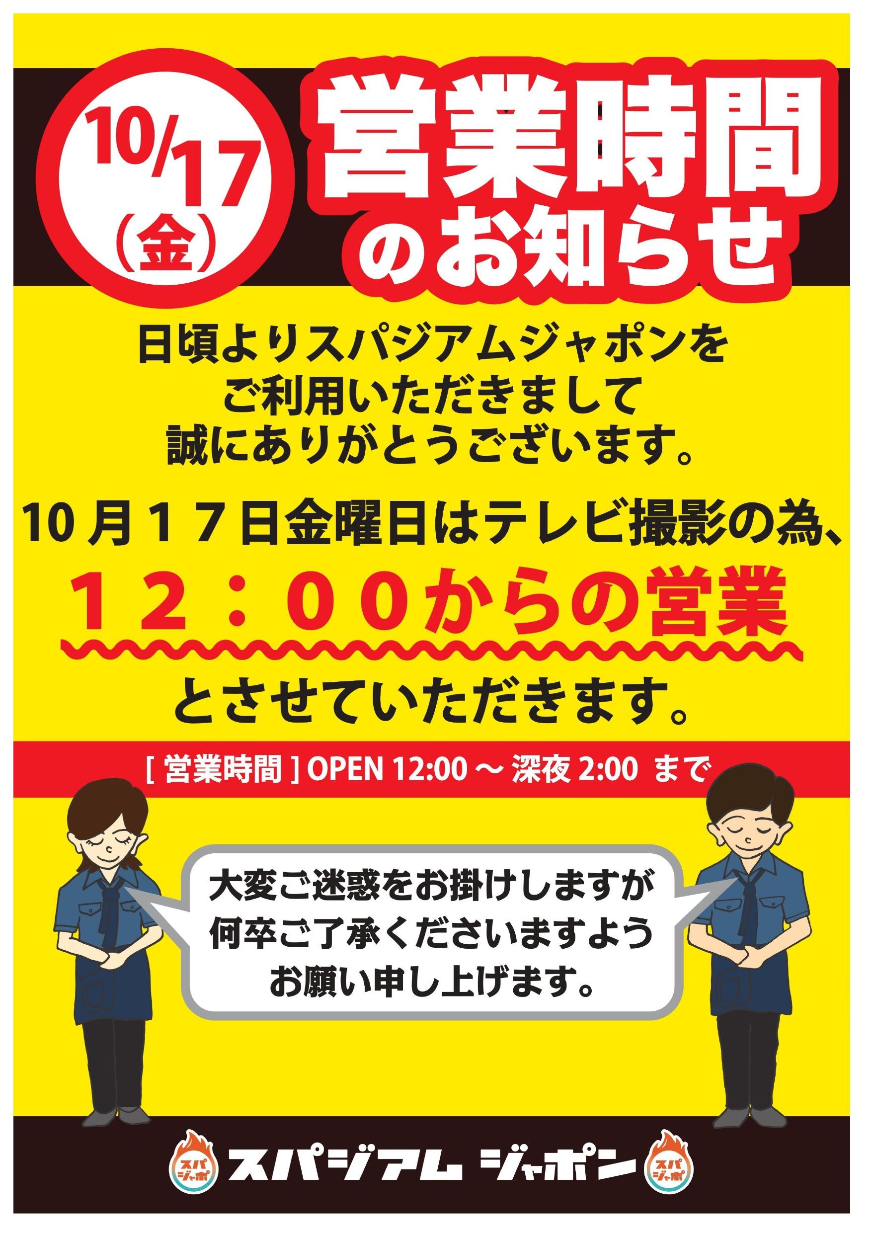 10月17日金曜日はテレビ撮影のため、12:00からの営業とさせていただきます。