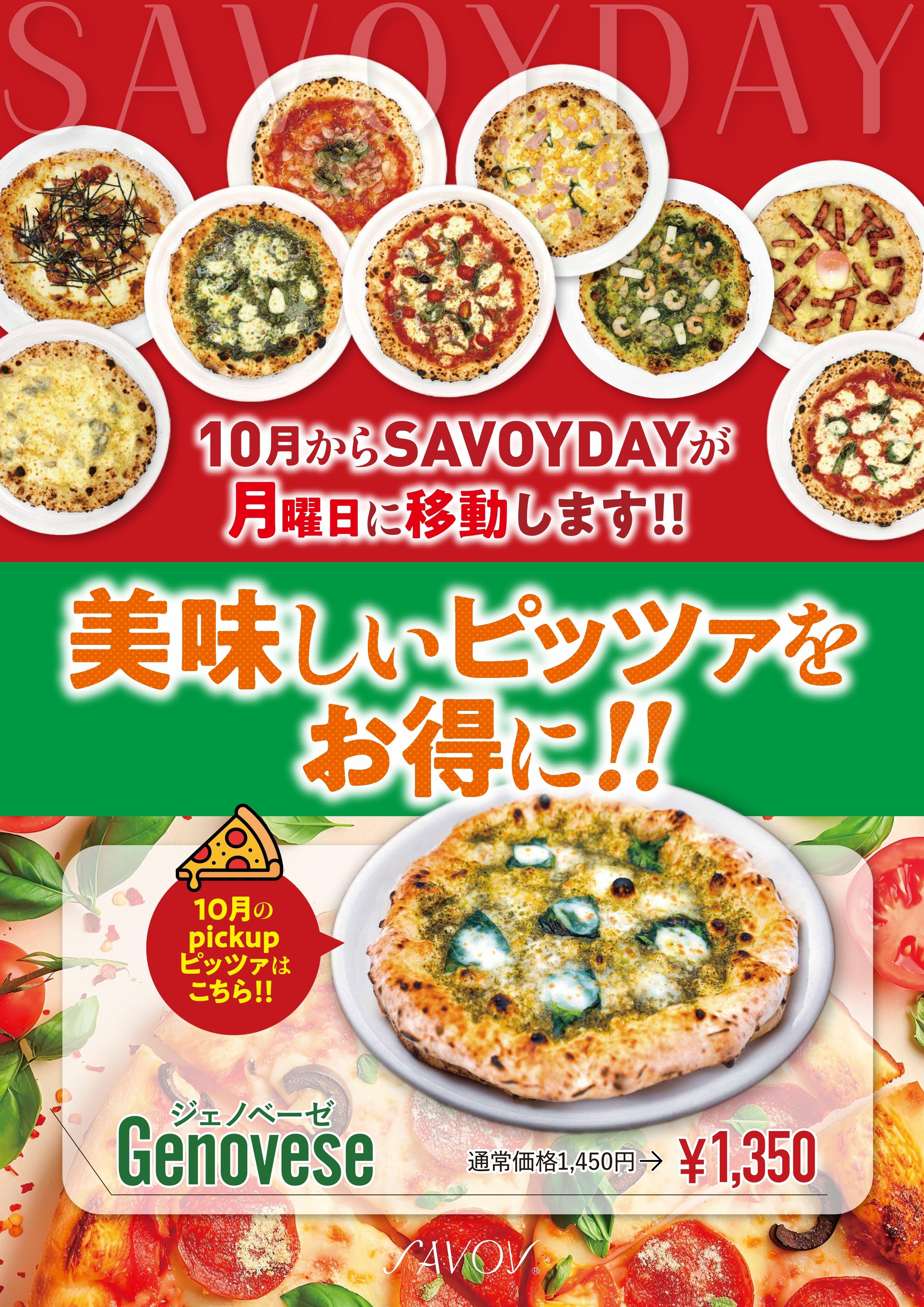 名店PIZZAがおトクに楽しめる SAVOY DAYが、10月から毎週平日月曜日にお引越し!